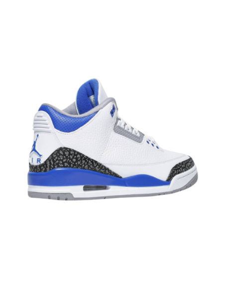 Las Jordan Retro 3 Racer Blue presentan una parte superior de piel blanca con textura granulada, refuerzos con estampado "elephant print" en gris y negro, y detalles en azul intenso en la mediasuela, el forro, los ojales y el logo del talón. Incorporan una unidad Air visible en la mediasuela para amortiguación, lengüeta acolchada y suela exterior de goma con tracción multidireccional.